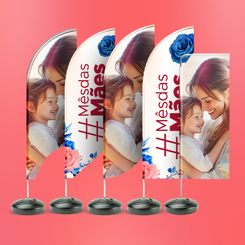 Sabe aqueles lojistas que já usam Wind Banners nas calçadas? Você pode sugerir para esse Mês das Mães a troca só do tecido. Comprar o tecido do Wind Banner Especial do Dia das Mães para atrair a clientela é uma ótima estratégia de vendas! Assim, é possível usar a mesma base e a mesma estrutura. Agora, se ele precisa renovar o Wind Banner completo, aproveite a ocasião e feche sua venda!