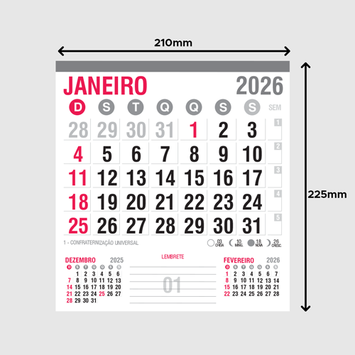 Além disso, detalhes como feriados, fases da lua e até espaço para anotações diárias permitem que o bloco se torne uma ferramenta eficaz de organização diária, mensal e anual para a sua empresa e seus clientes.