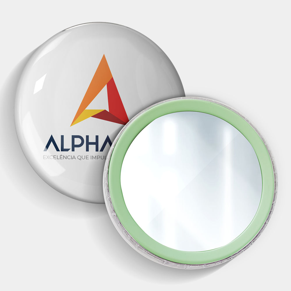 O botton é mais do que um acessório, sendo útil no dia a dia por contar com um espelho portátil, ideal para levar em bolsas e mochilas. Além disso, ele também é uma forma de divulgar a sua marca de maneira útil e estética, especialmente como opção de brinde para colaboradores e clientes.