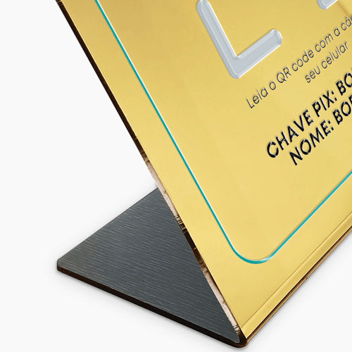 Há opções de acrílico branco, transparente, preto, espelhado prata e dourado, com impressão DTF UV e acabamento em verniz.