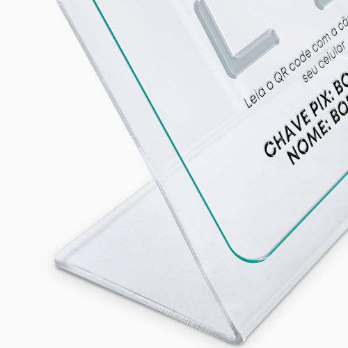 Ele tem como principal função destacar e proteger o conteúdo, o que se torna ainda mais evidente com as opções de cores disponíveis — acrílico transparente, branco, preto, espelhado prata e espelhado dourado.